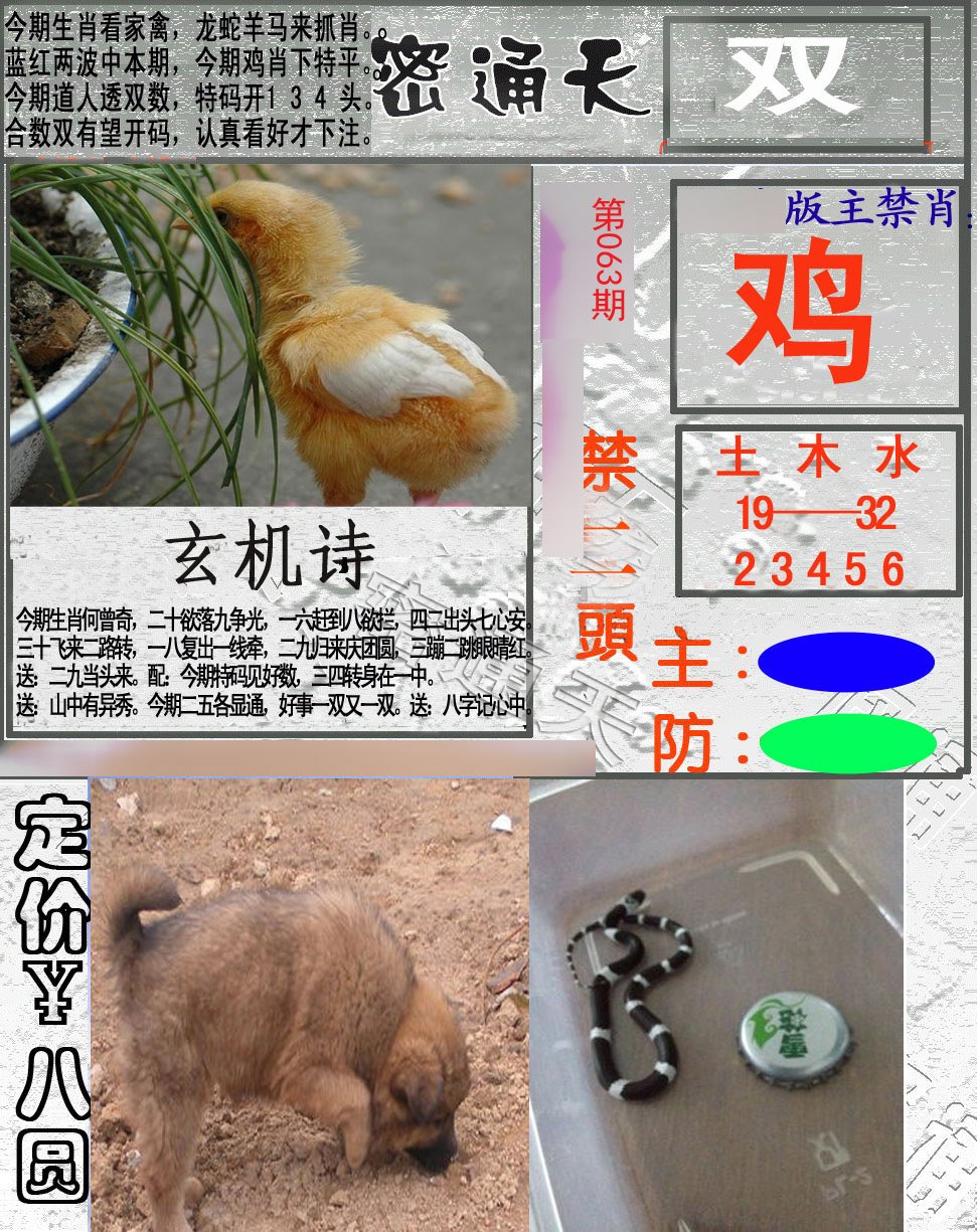 | 063期:精选九肖:猪鼠鸡羊猴兔蛇牛狗 |